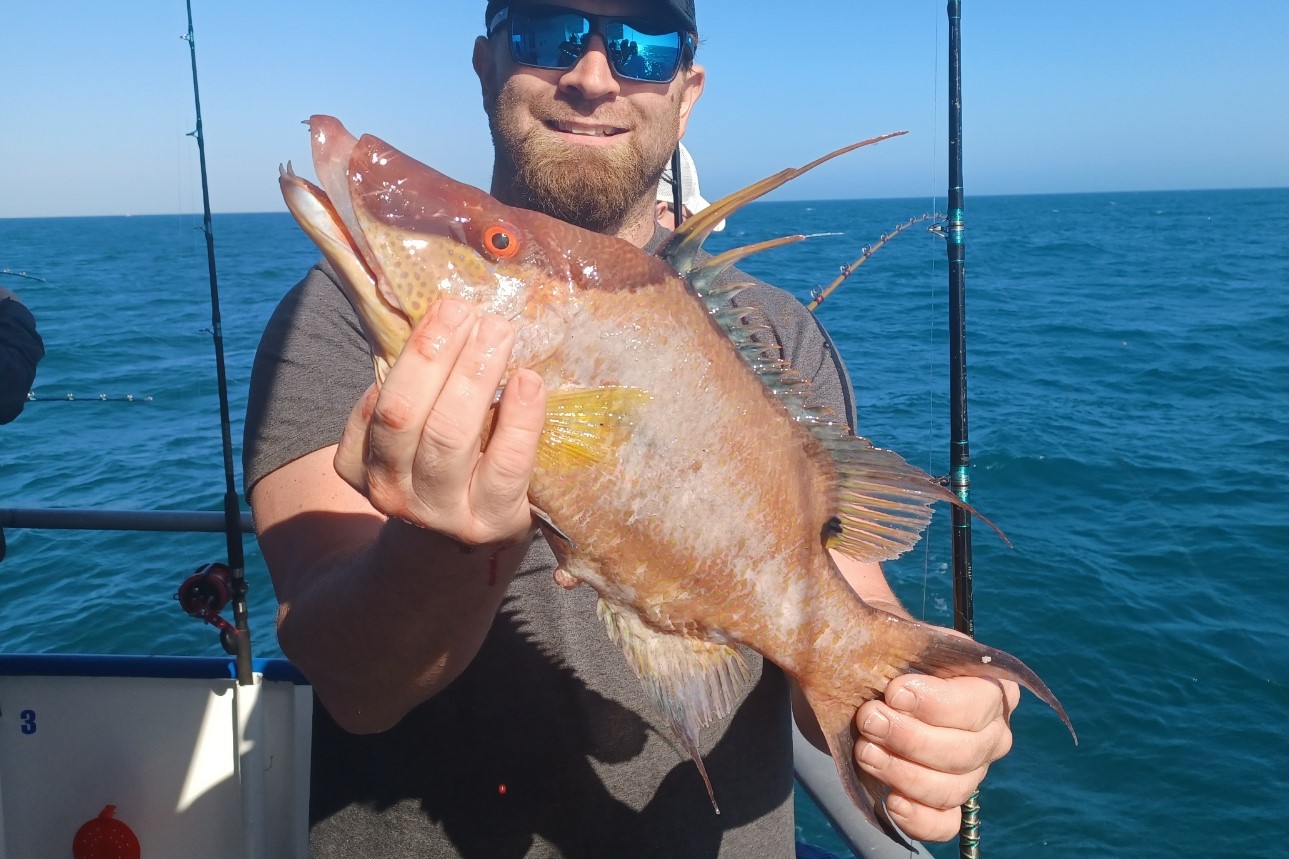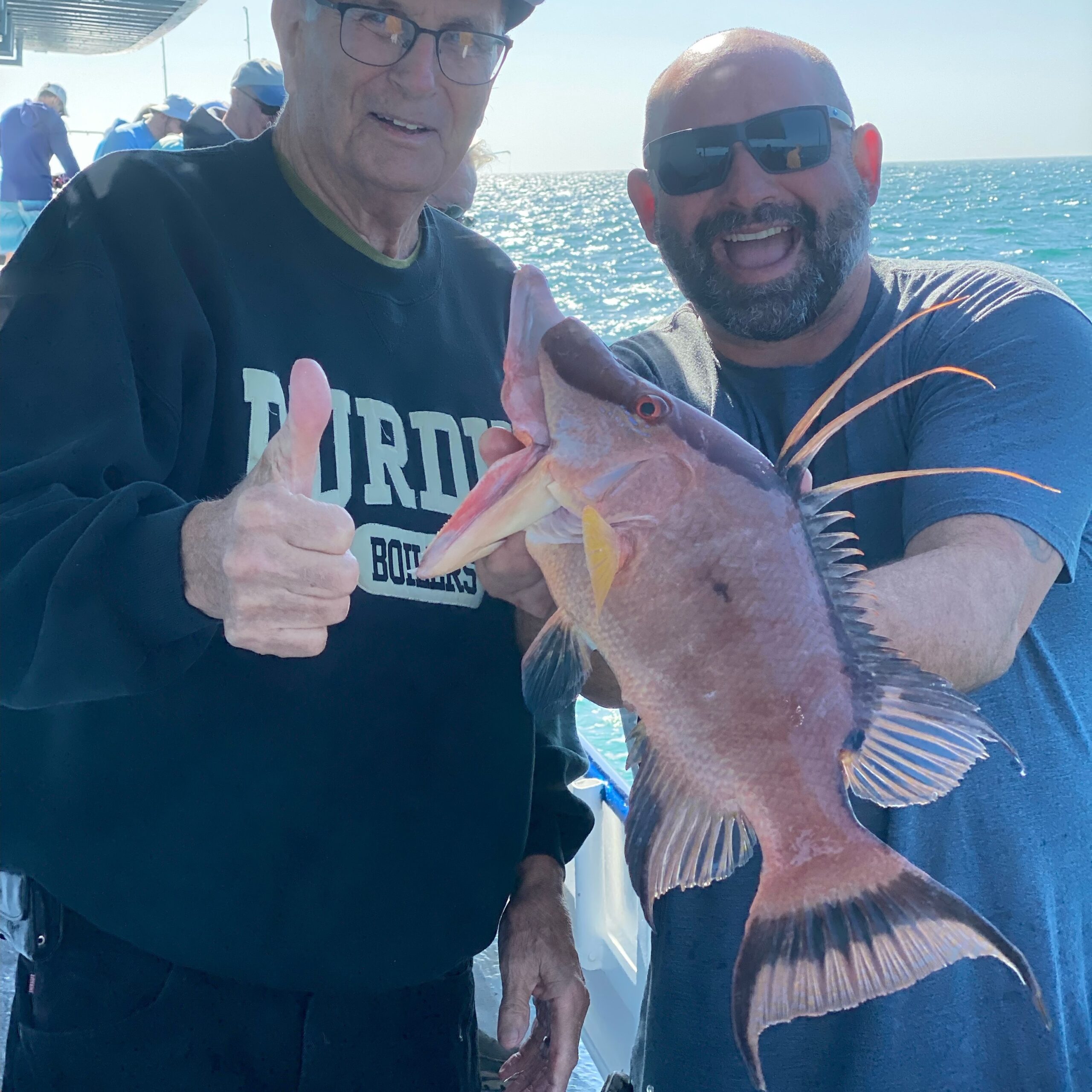 Hogfish action near shore has been really going well for us and many anglers around 40-80ft of water. We are really targeting them most around 50-70ft of water and doing well using live shrimp and lighter tackle. Our ten hour all day gives us the most amount of time to really dial into catching them, but the half day sometimes rivals our all-day catches when they are ready to eat. They love some live shrimp, but will take sandfleas, rock shrimp and fiddler crabs too. We do see them bitte squid and small pinfish, but not super common. They are cruising just above the bottom looking for crustaceans on that shell bottom adjacent to the ledges, flat hard bottom with the sea fans and other growth, or swiss cheese areas with the occasional rock. If you get to larger ledges and bigger structures its much trickier to dial in to the hogfish with so many other more aggressive species around. Often, when targeting hogfish, you must pick through a bunch of the grey snapper, undersized red grouper, sand perch, lizard fish and finally porgies before you start to see the hogfish bite well. Patience and persistence are key when trying to find the hogfish, especially when trying to find the right depth and area. Using spinning rods and reels are the go-to for us due to the ability to feel the bite even more and have something that has a higher gear ratio. Make sure you have a super light, sensitive rod with a solid back bone as a nice hogfish can really give you a great fight. We typically use around a 3000-4000 series spinning reel and you really want something light and strong when going after these unique looking and great eating fish. Because they are looking for those crustaceans, we often find using a knocker rig with a few red beads helps us to get some noise going and often helps to lure in the hogfish to your shrimp. Also, casting out away from the boat letting your bait hit bottom and every now and again lifting your wrist a bit to bounce that set up closer to the boat seems to help as well. Each time that weight lifts off the bottom and bounces closer to the boat it creates a little puff of sand on the bottom which is detrimental to targeting most any other quality fish but rings the dinner bell for the hogfish.
