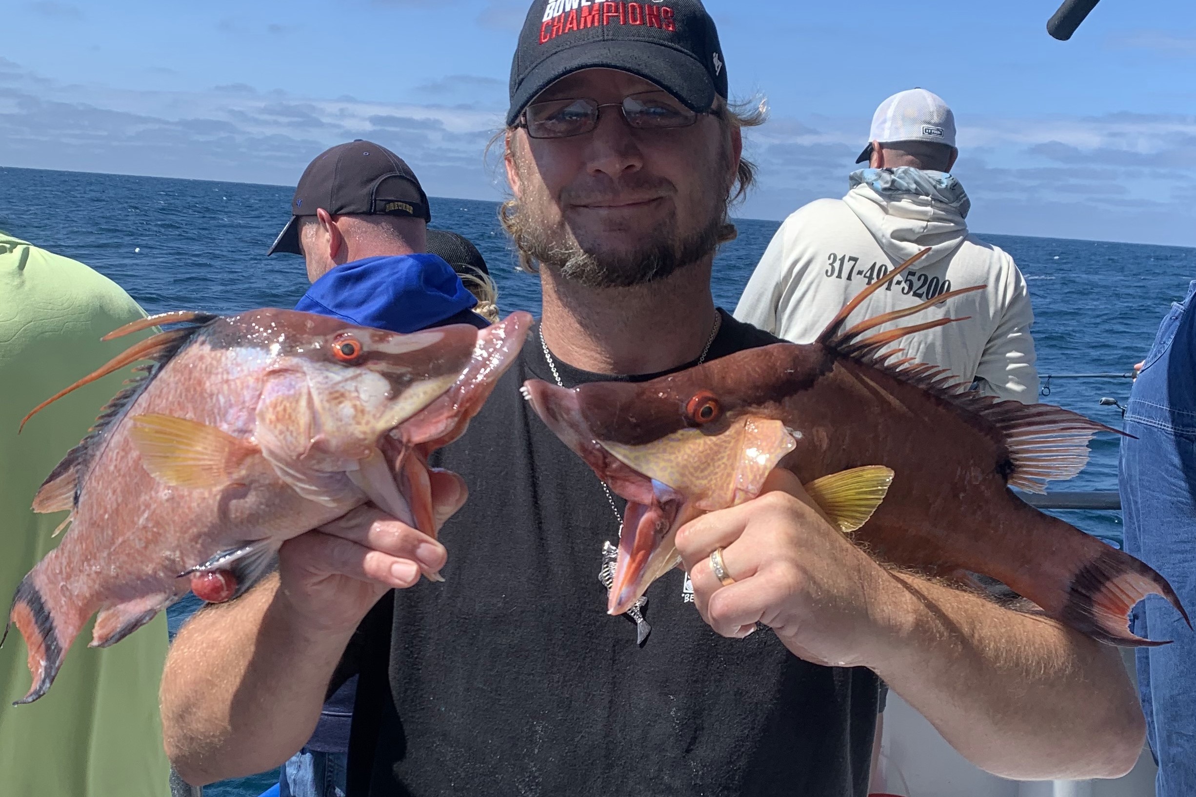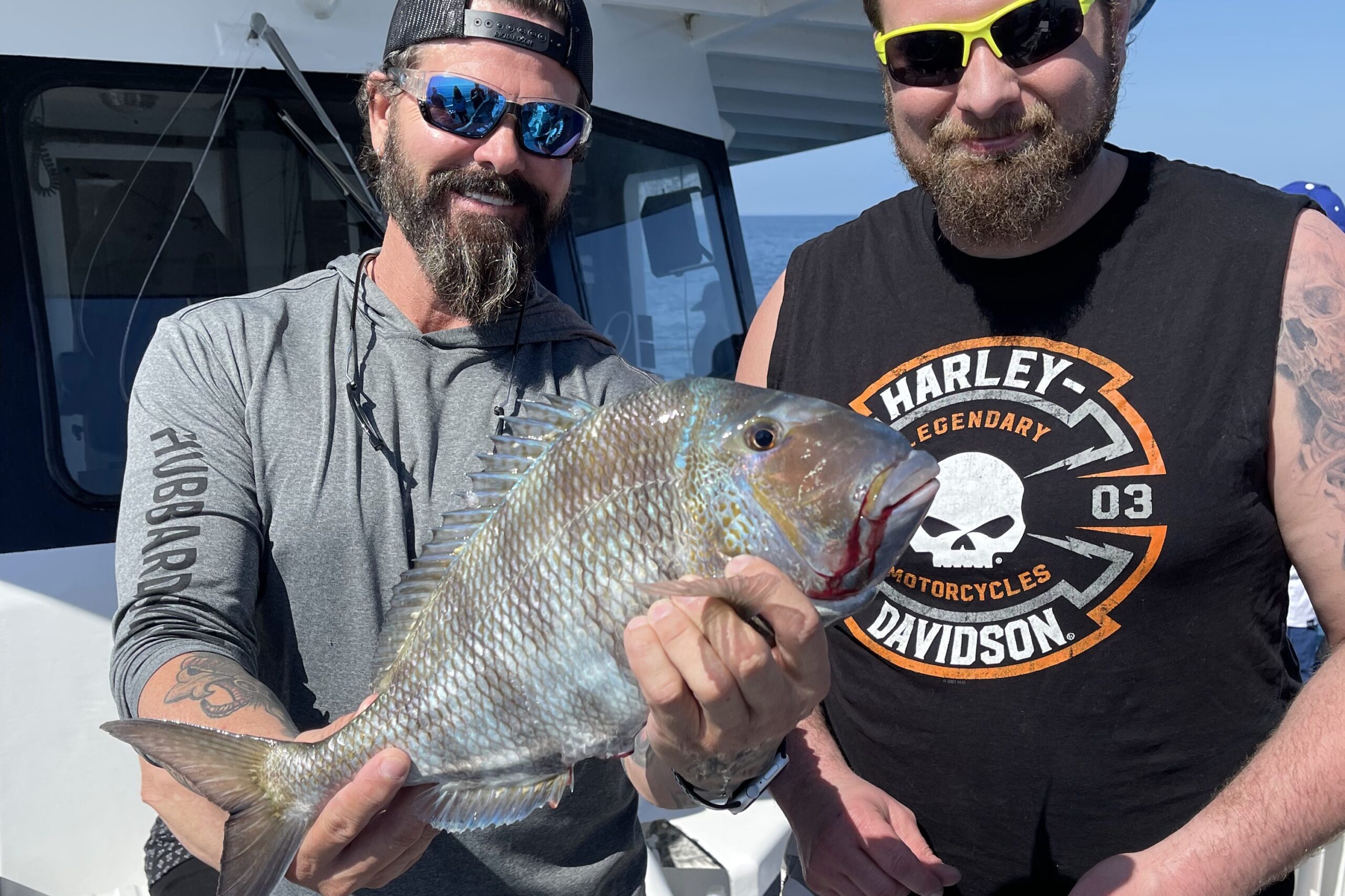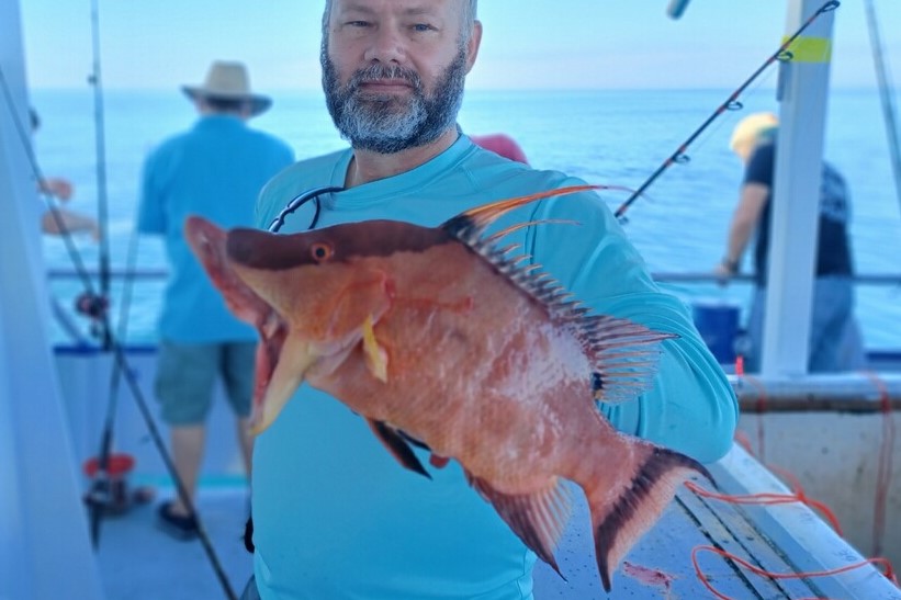 Hogfish once again dominates the near shore report with them biting well for us near shore around 40-80ft of water. Especially closer to around 60-70ft we are seeing solid hogfish action on smaller ledges, small rock piles, hard flat bottom, and that shell bottom adjacent to the bigger structures. They are always going to be the most leader shy, unaggressive fish around, last to bite typically. This requires a bit of patience, luck, and a little practice to fish through some of the more aggressive fish waiting out the hogfish to chew. Often, you can help overcome this with lighter tackle and live shrimp. Some will even double up two shrimp on one hook to make it more enticing for the hogfish and help give you more time on the bottom since its so easy for even the smallest of fish to pull a shrimp off the hook. We are still mostly using the knocker rigs with around 1-2oz leads and around 3-4ot hooks and around 3-5 of the 5mm red beads between the lead and the hook. However, you can use the jig heads or ball jigs to target them as well.